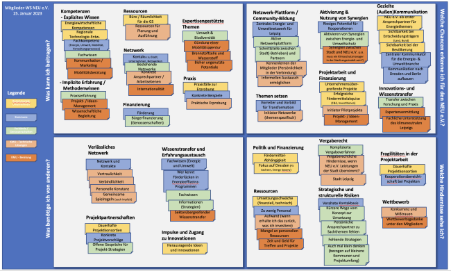 For the first member workshop in January 2023, association members were invited to think about why they are members, where we are headed as a network, and what we want to achieve. Over half of the members actively participated. The workshop explored what each member company can contribute to the association, what they need from others, and where they see opportunities and obstacles. The results were clustered according to the groups: municipal companies, municipalities, associations/cooperatives, consulting SMEs, and SMEs for technical solutions. The wealth of possibilities thus became not only tangible but also visible. As a result, the association not only activated its members, but also decided on the new format of the idea workshops and paved the way for regional expansion into central Germany. In addition, it became clear that the “Energiemetropole Leipzig” brand no longer fits the network's goals.